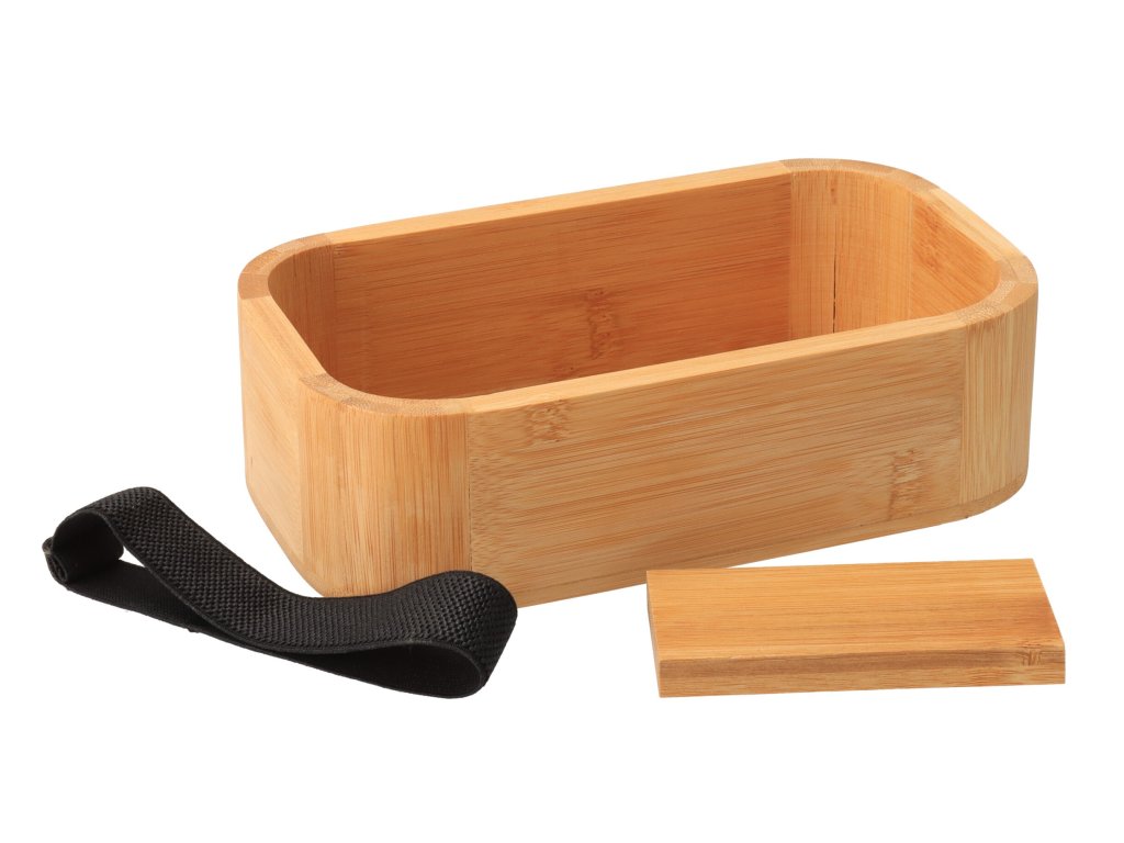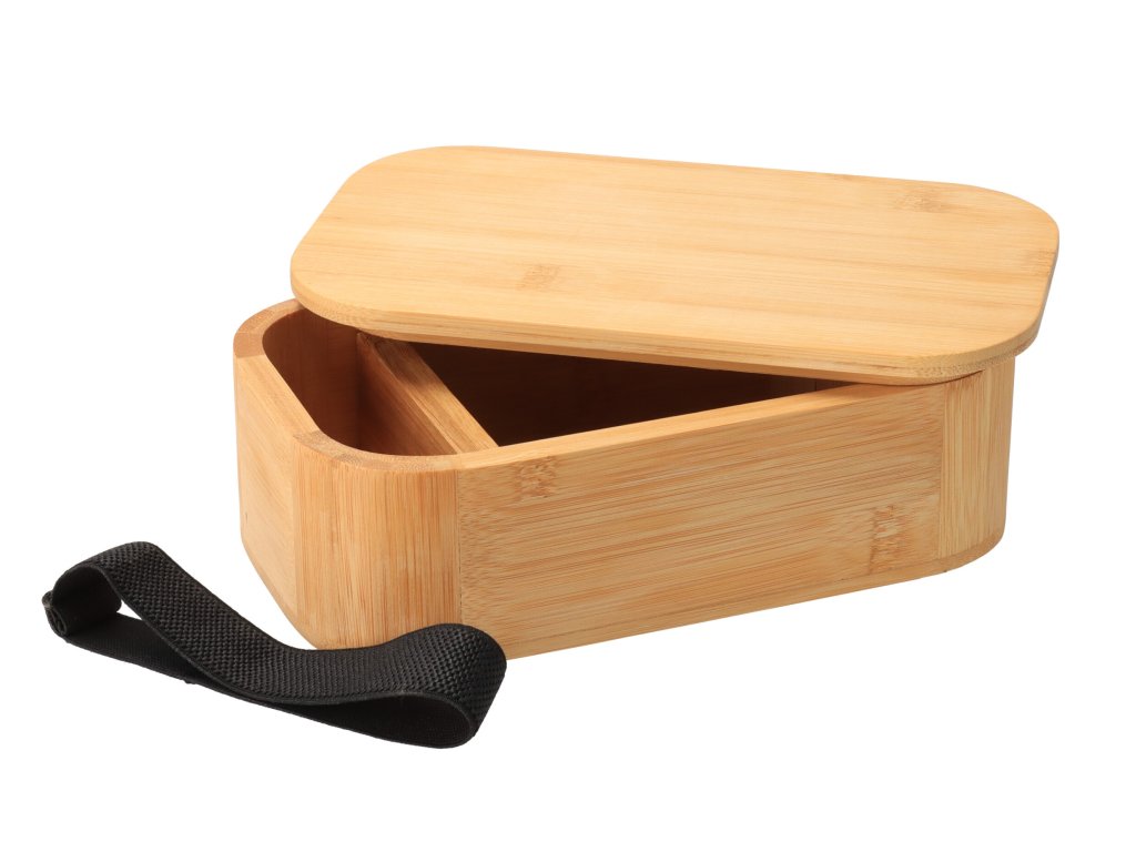 Praktična bambusova škatla za hrano s snemljivo pregrado in močnim najlonskim trakom, v katero lahko shranite okusno malico ali kosilo. Namenjen je predvsem suhi hrani.