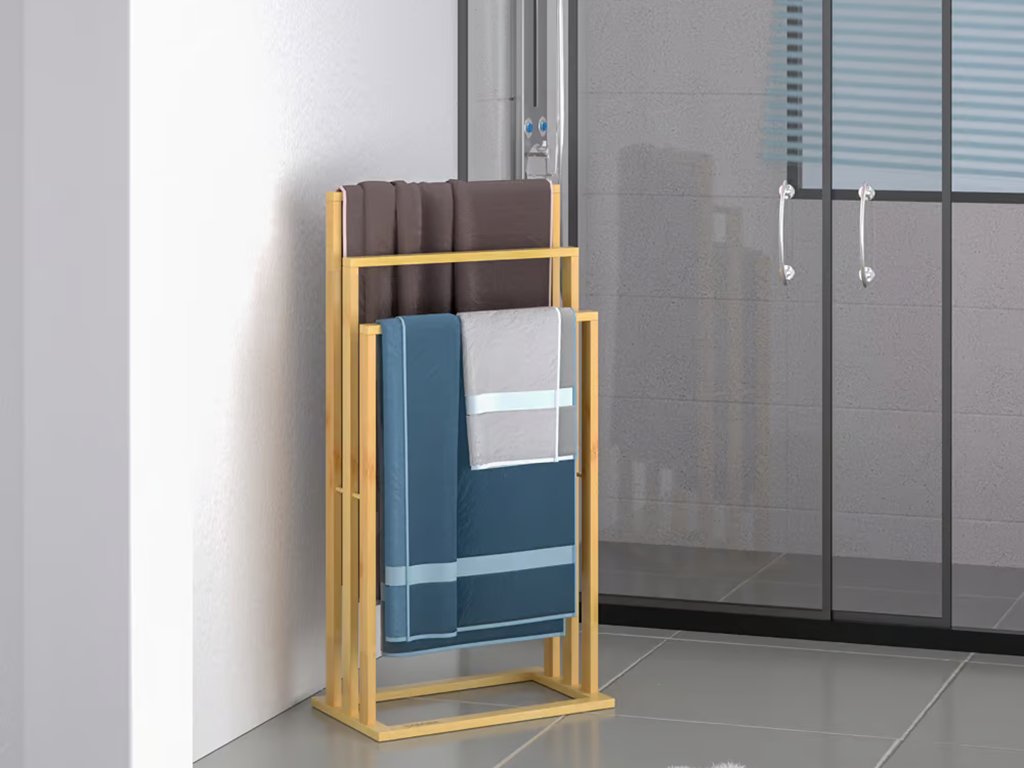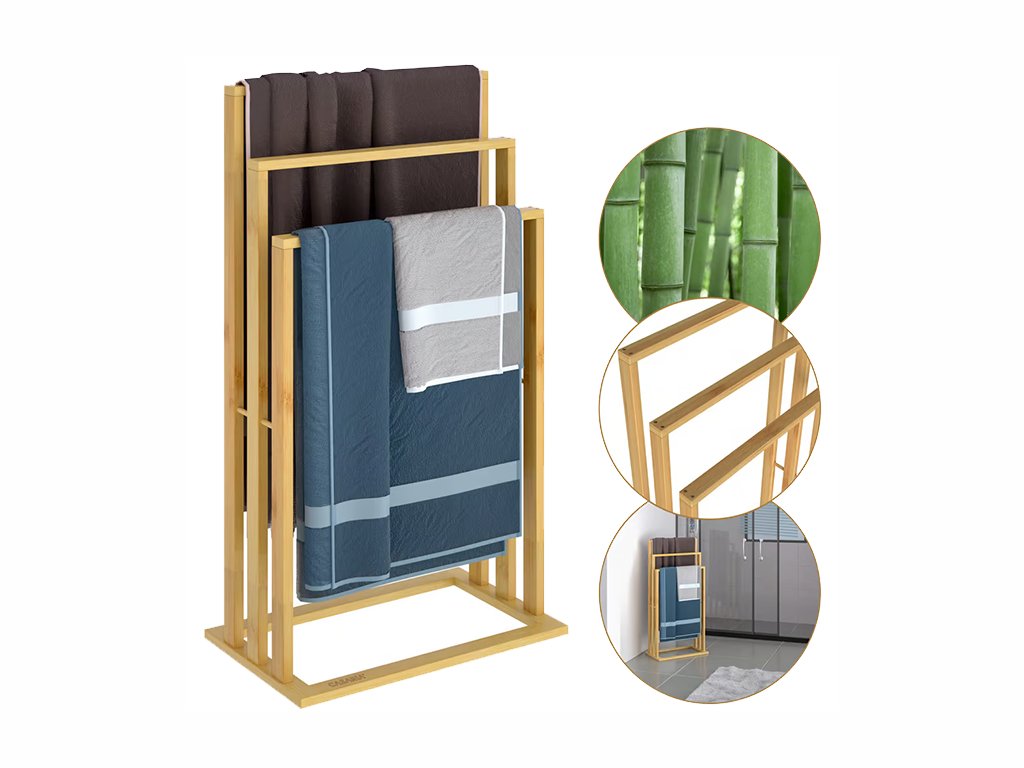 Praktično samostoječe držalo za brisače je opremljeno s tremi palicami, razporejenimi v obliki stopnišča, kar zagotavlja optimalno kroženje zraka in hitro sušenje brisač brez neprijetnega vonja.