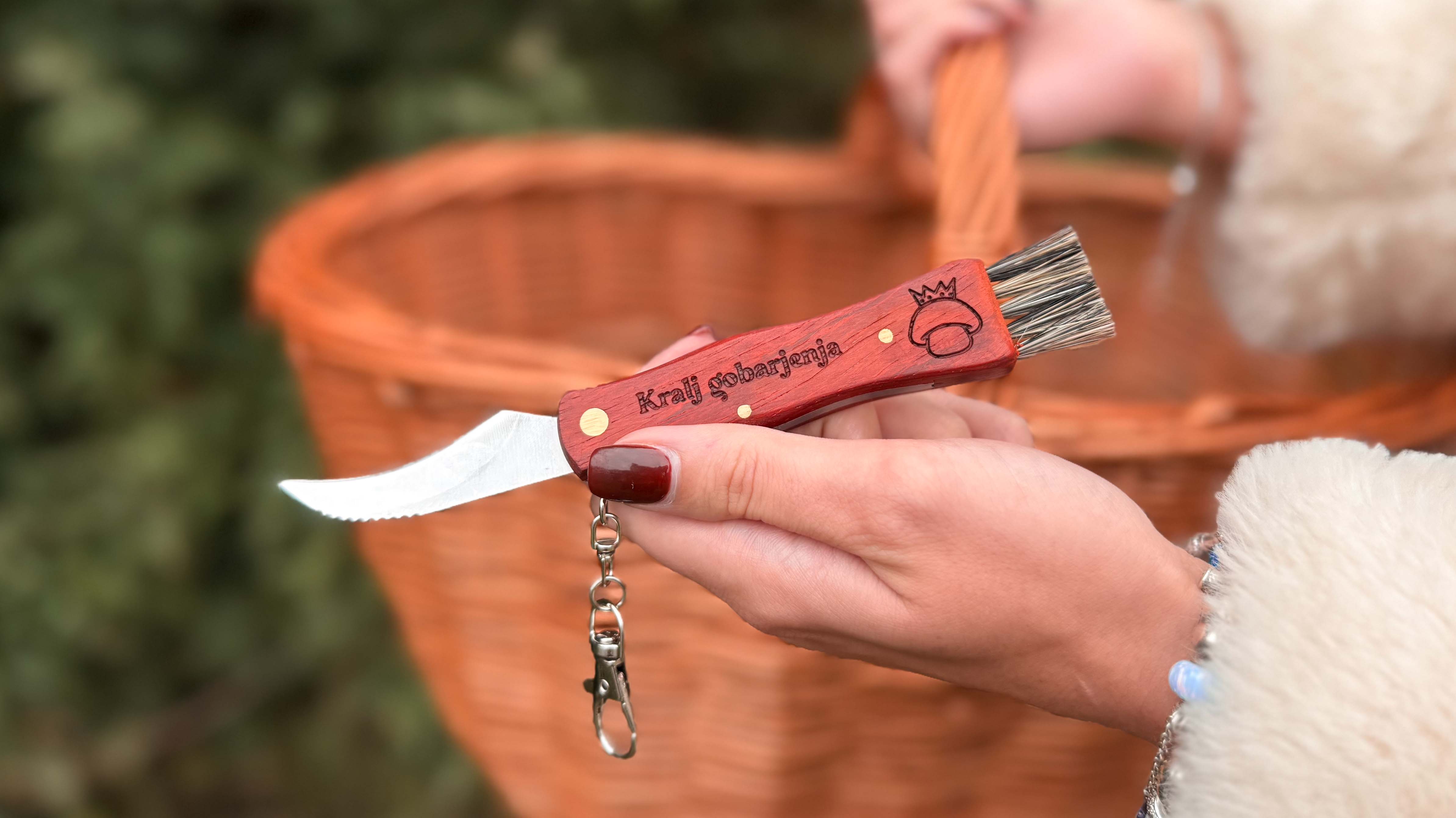 Gobarski nož s preklopnim rezilom in krtačko za čiščenje jurčkov je nepogrešljiv pripomoček vsakega gobarja. Leseni ročaj odlično sede v roko, posebna oblika rezila pa olajša delo z nožem.