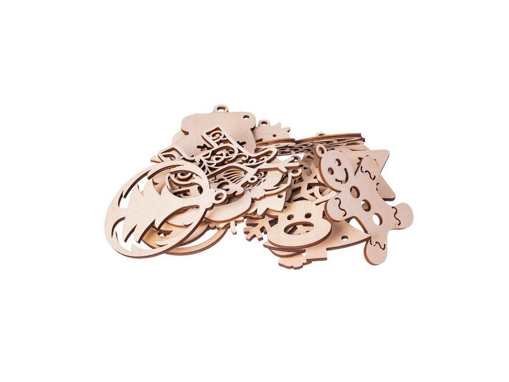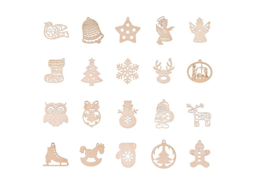 V paketu boste našli novoletno jelko, zvonček, snežinko, pa tudi gugalnega konjička ali sovico. Vsi okraski so veliki približno 8 cm in niso nič obdelani.