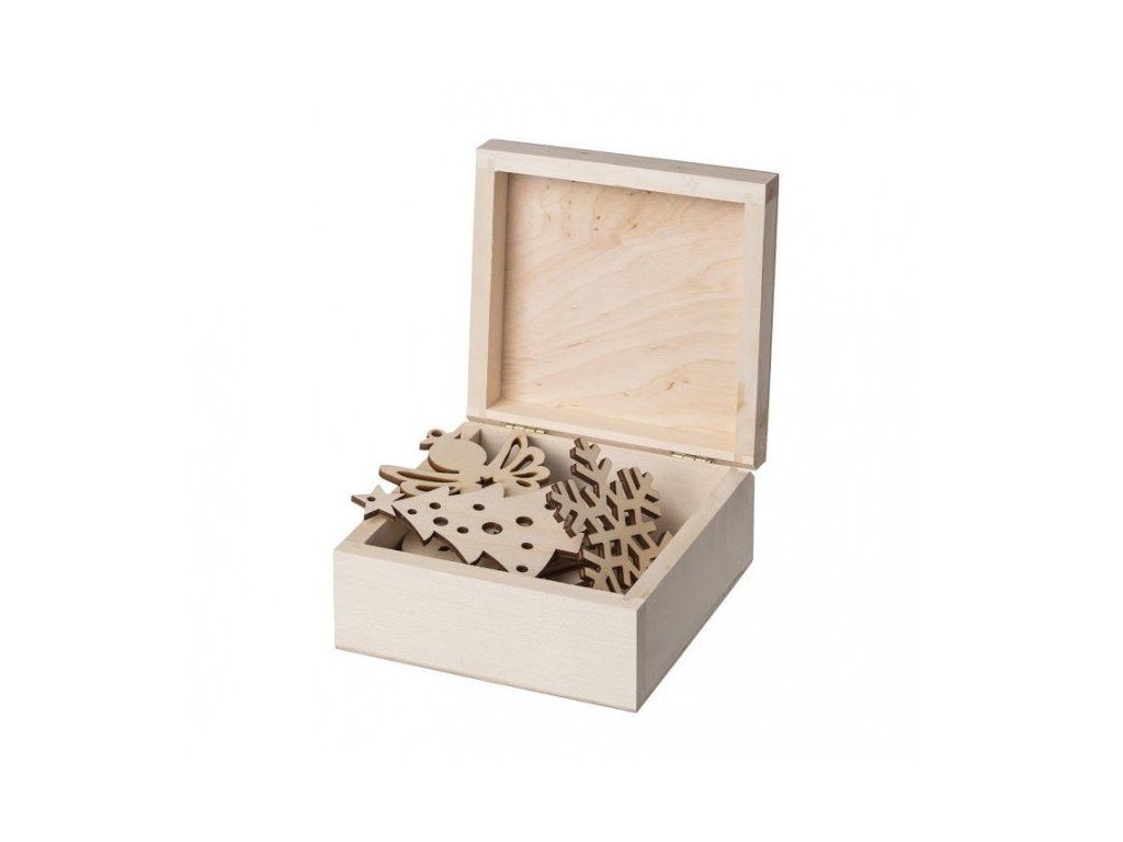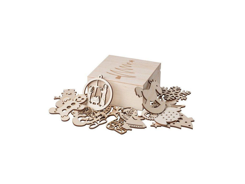 Zbirka dvanajstih lesenih božičnih okraskov v darilni škatli z ožganim drevescem.