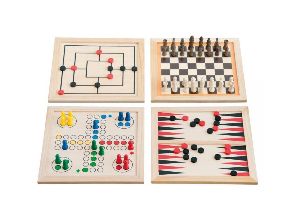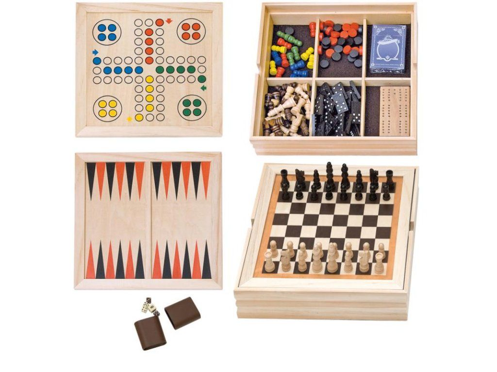 Več družabnih iger v eni škatli - šah, dama, človek ne jezi se, backgammon, begamon, mlin, domine in karte.