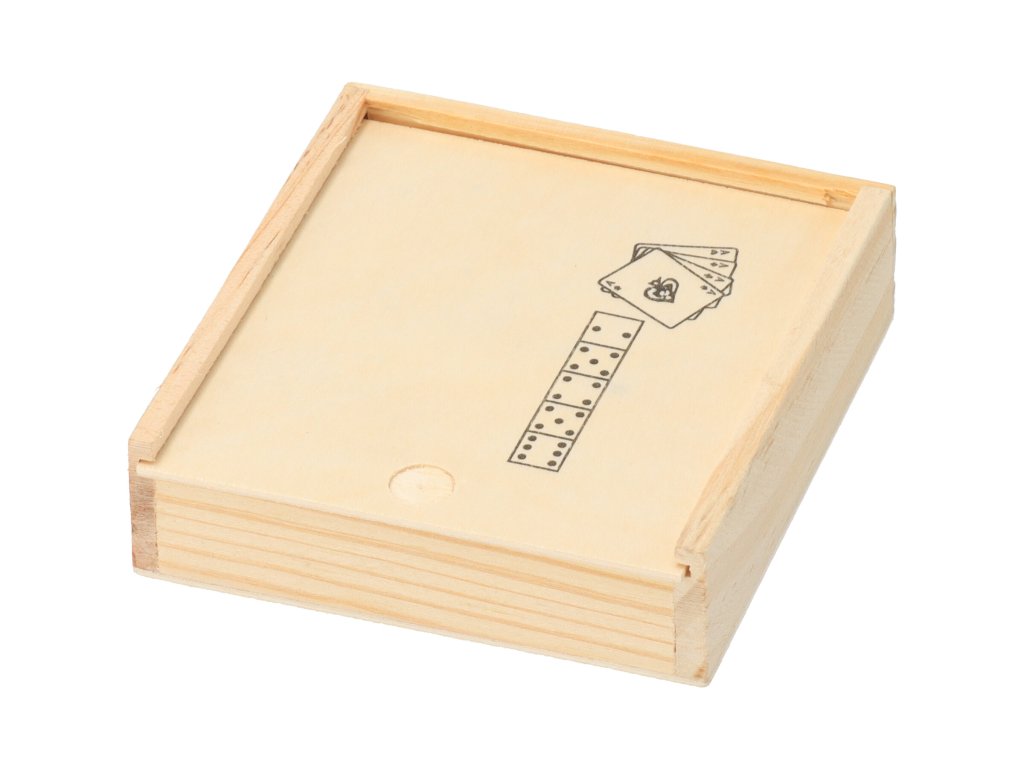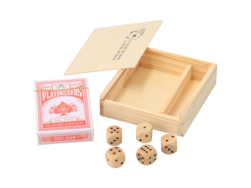 Karte in kocke so lepo pospravljene v škatli iz lesene vezane plošče, ki jo lahko zaprete in vzamete s seboj na izlet.
