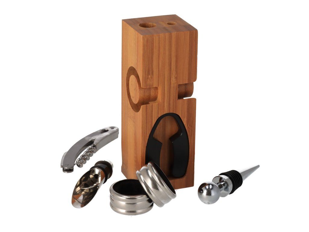 Originalen 6-delni set v lesenem stojalu, ki vsebuje vse kar potrebujete za delo z vinom. Elegantno darilo za gurmane in vse ljubitelje vina.