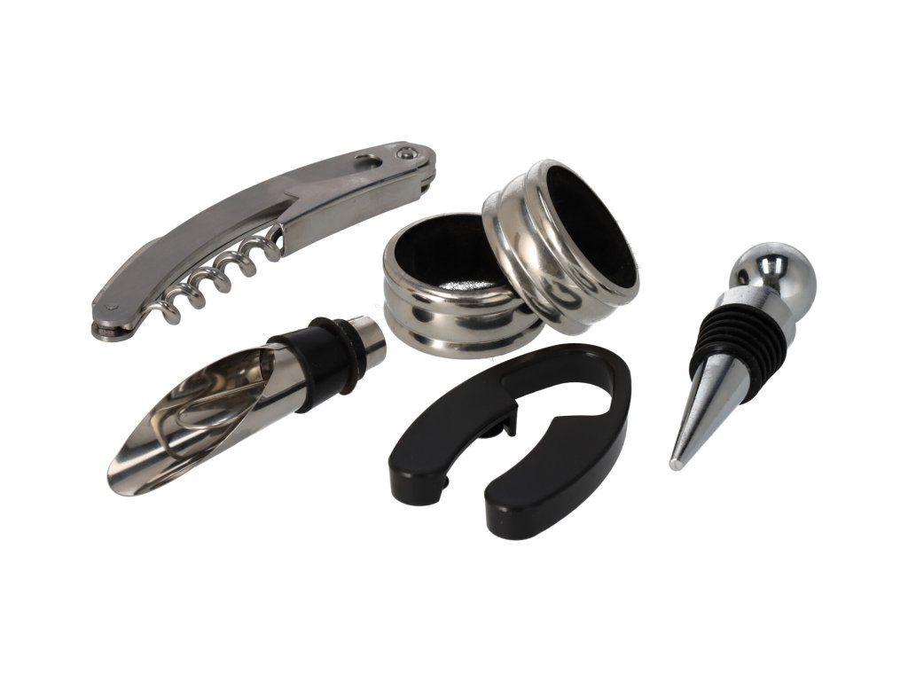 Iščete elegantno darilo, primerno za poznavalca vin? Originalni 6-delni darilni set v leseni škatli vsebuje vse, kar potrebujete za delo z vinom.