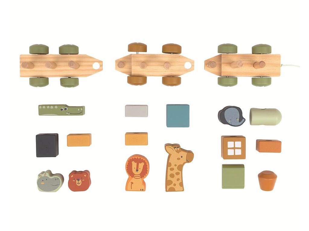 Čudovit komplet lesene lokomotive in vagonov, ki prevažajo živali, ne sme manjkati v nobeni otroški sobi. Manjši otroci bodo svojo fino motoriko urili z zlaganjem lokomotive in povezovanjem vagonov, večji pa lahko razvijajo svojo domišljijo z izmišljevanjem zgodb in živalskih dogodivščin.