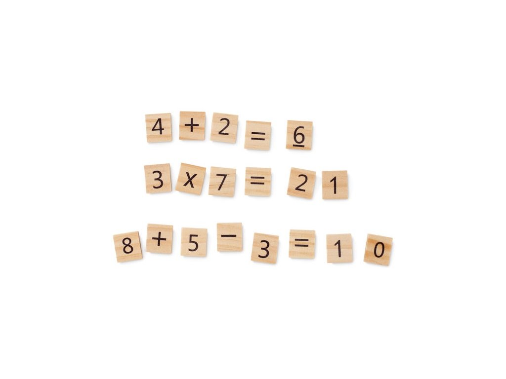 Komplet vsebuje po dve števili od 0 do 9 in matematične simbole + - × ÷ = /. Kocke dimenzij 1,8 x 2 x 0,5 cm so izdelane iz najkakovostnejšega bukovega lesa in shranjene v bombažni vrečki.