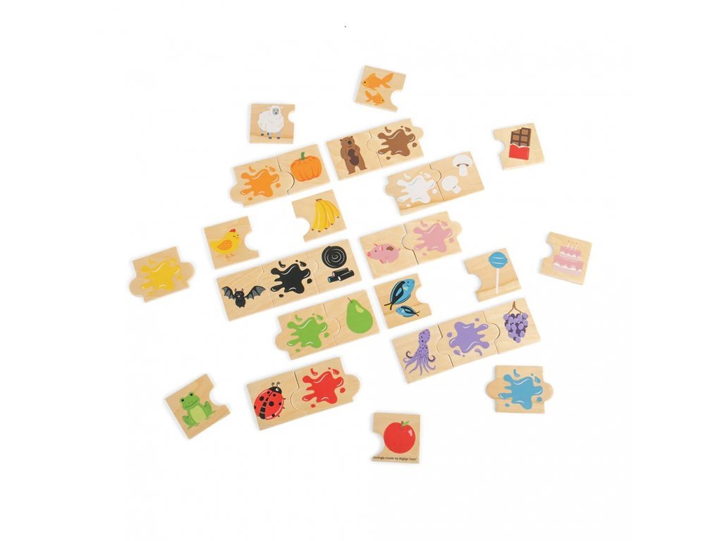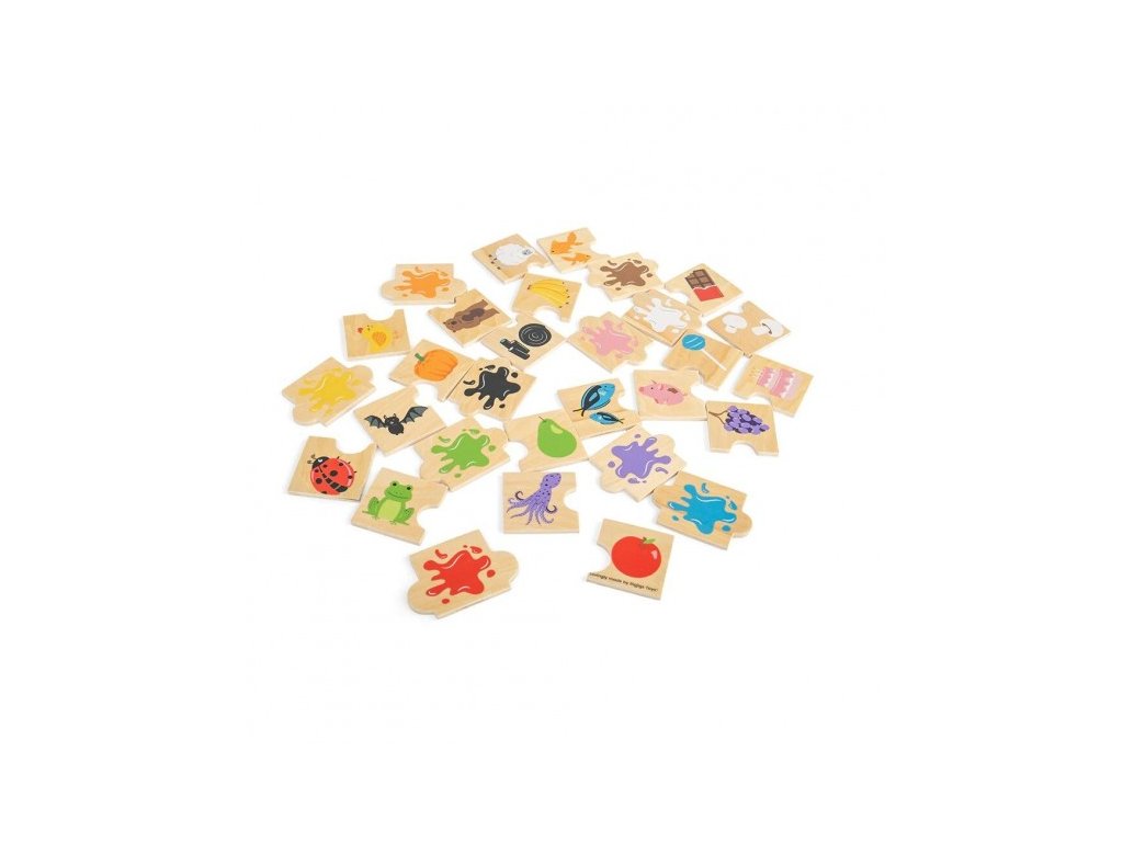 Lesena sestavljanka je vir neskončne zabave za otroke. Sestavljanje posameznih kosov pomaga razvijati koordinacijo, uči otroke reševati probleme in pomaga uriti socialne veščine in sodelovanje. Igra vsebuje 30 kosov, ki jih je treba razporediti po tri po barvah.