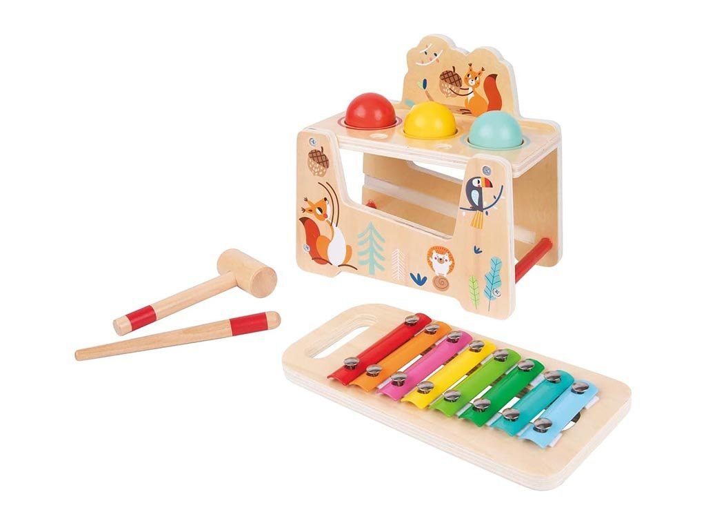 Združite gibanje, igro in glasbo v eni zabavni dejavnosti. Lesena igra s kladivom in ksilofonom otrokom ponuja edinstveno izkušnjo – ko s kladivom tolčejo kroglice, se oglasi pisan ksilofon in ustvari veselo melodijo, ki otroke motivira k vedno znova igranju.