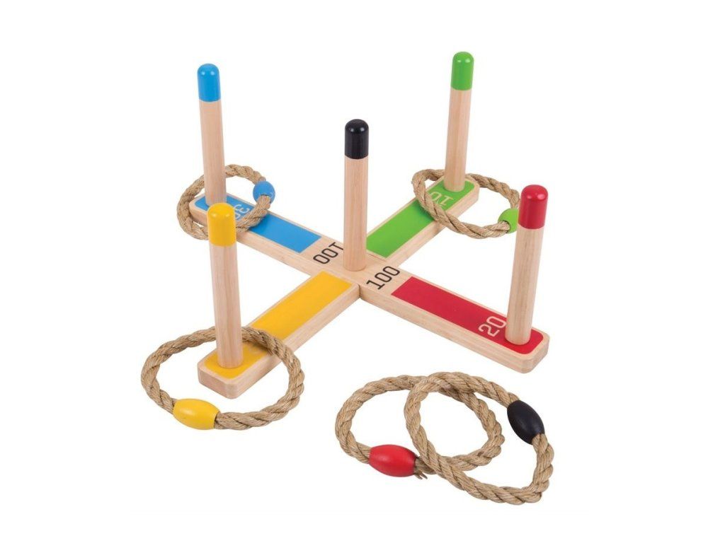 Cilj je s palicami vreči 5 pletenih vrvnih obročev na lesen križ in zbrati čim več točk.