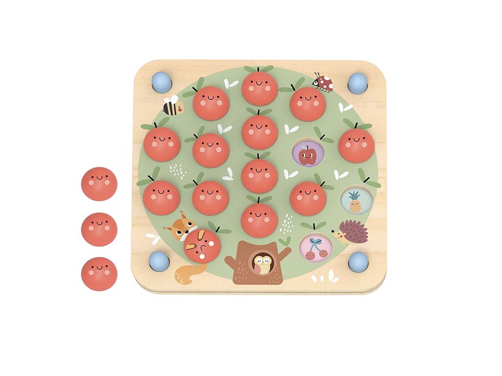 Zabavna in izvirna igra v obliki lesene spominske igre z jabolki bo navdušila vse male igralce, ki radi odkrivajo in urijo svoj spomin. Pod veselimi rdečimi jabolki se skrivajo slike živali, sadja in narave - naloga je najti pravilne pare.