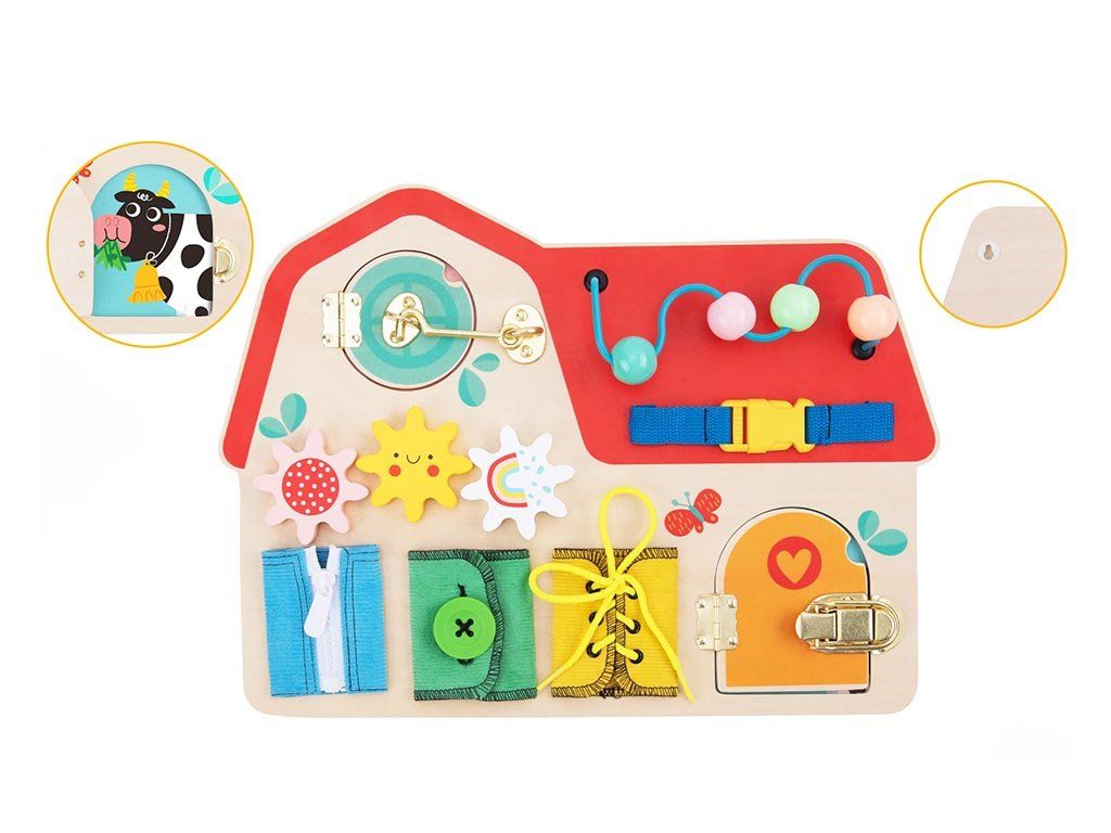 Lesena manipulativna plošča v obliki hiše ponuja široko paleto interaktivnih elementov, ki otrokom omogočajo, da na igriv način vadijo spretnost in logično razmišljanje. Vsaka podrobnost na plošči vabi k raziskovanju in podpira otroško naravno radovednost.