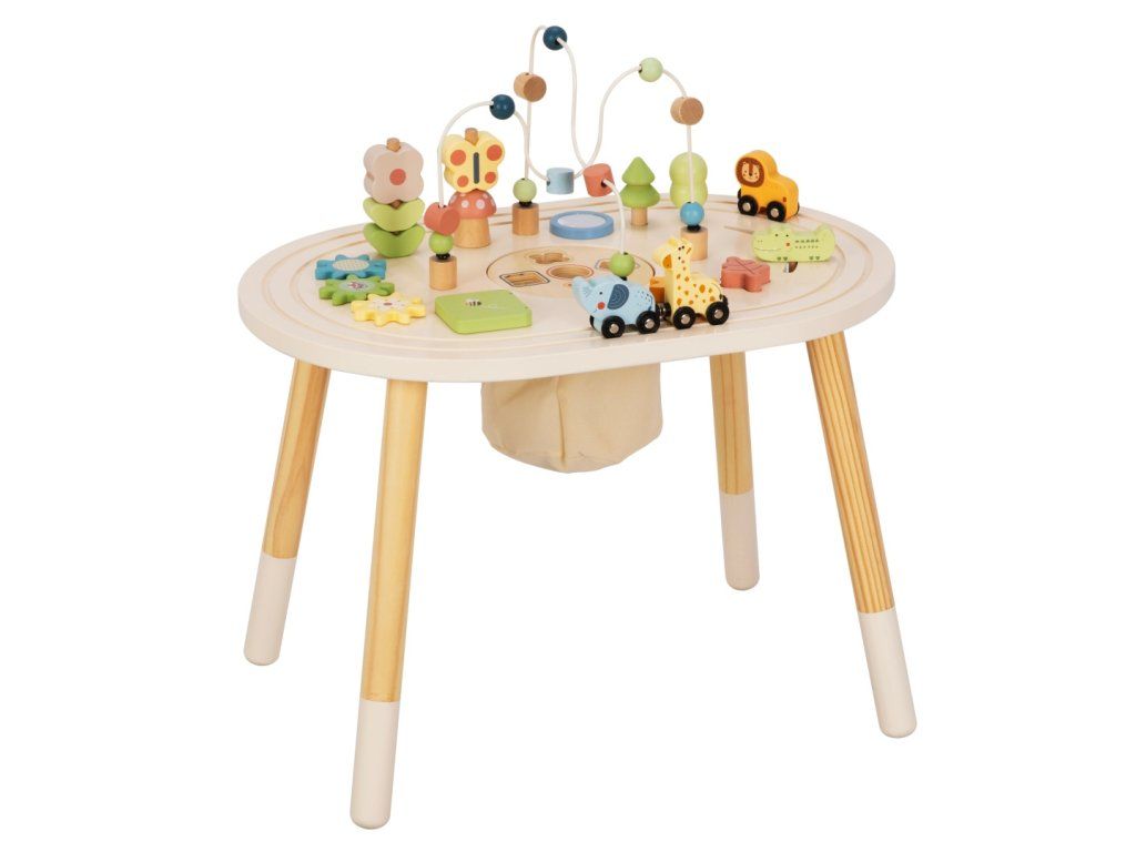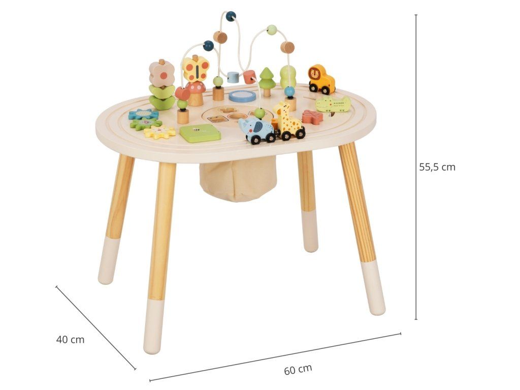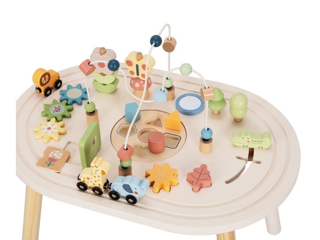 Podarite svojim otrokom lasten igralni center, poln odkritij. Lesena miza za aktivnosti ponuja različne zabavne elemente, ki bodo otroke zabavali in spodbujali njihov naravni razvoj. Zahvaljujoč stabilni konstrukciji in premišljeni zasnovi se lahko otroci udobno igrajo stoje in odkrivajo svet okoli sebe z nove perspektive.