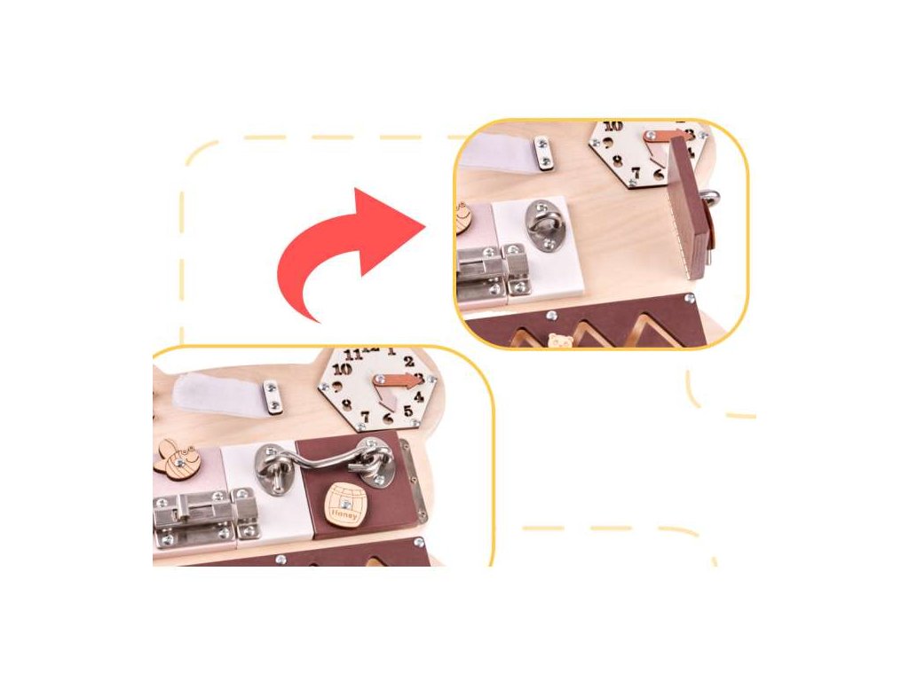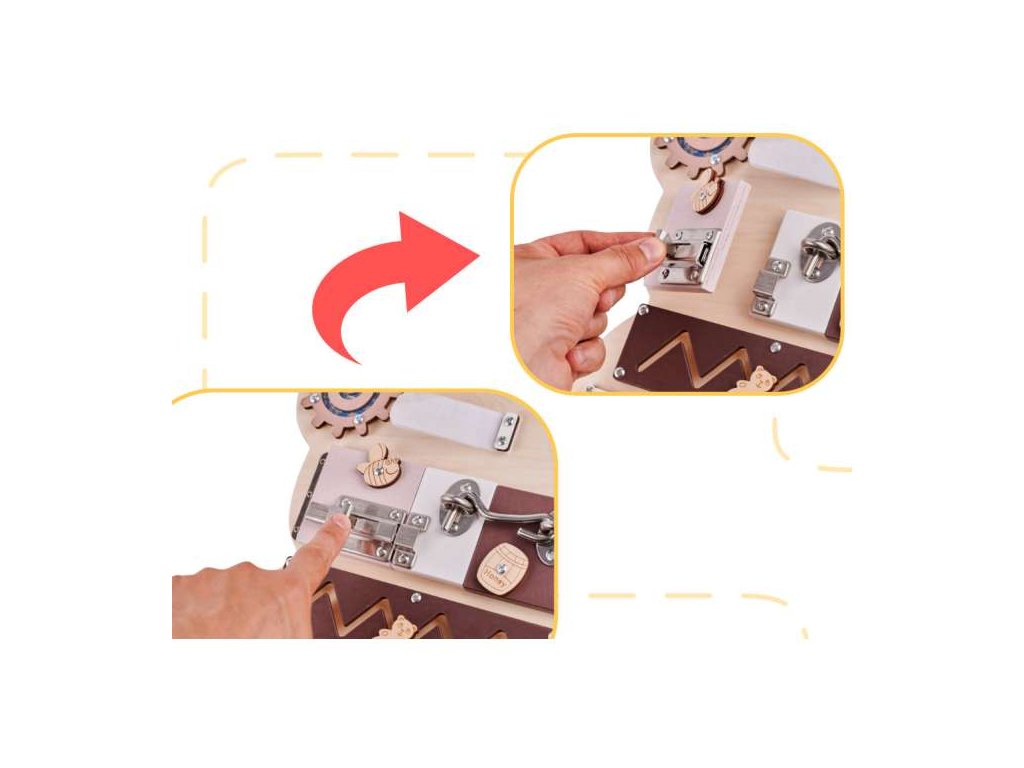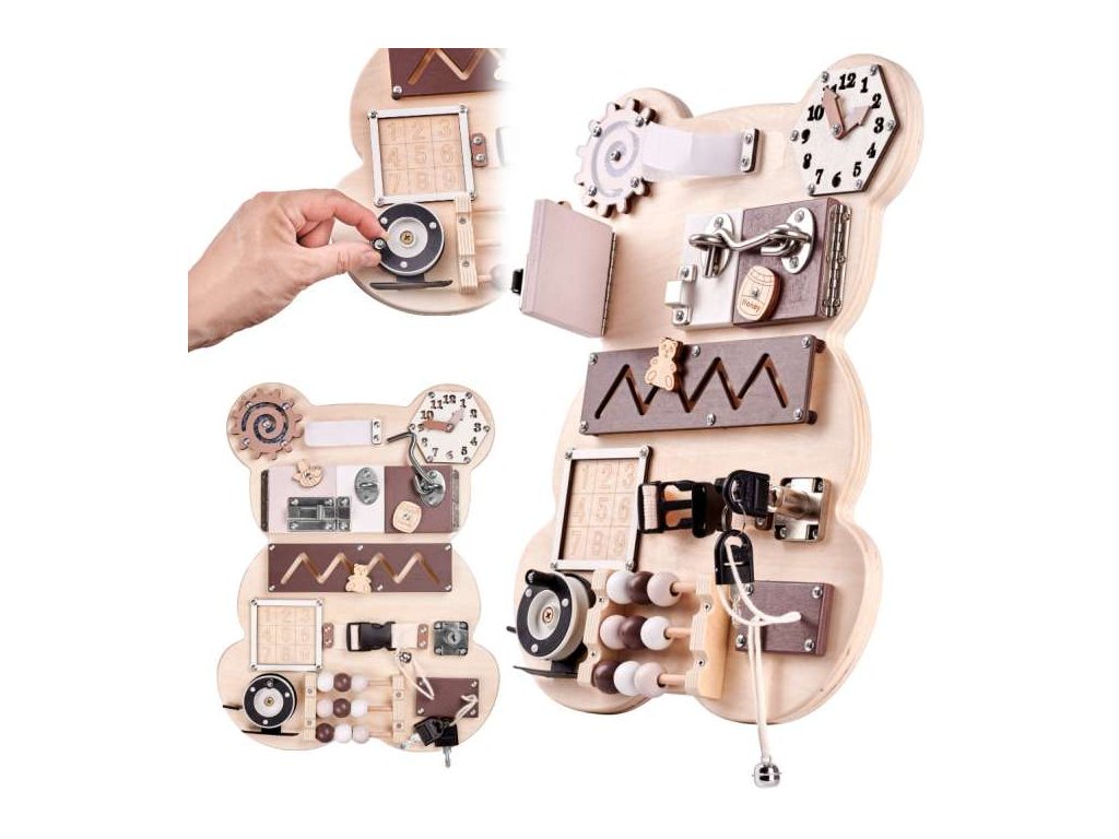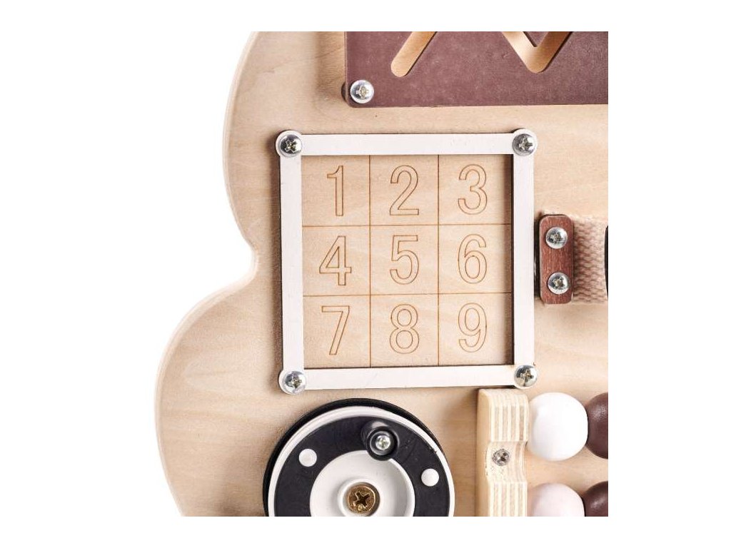 Na tabli je veliko elementov, ki so namenjeni aktivaciji malčka, od najpreprostejših dejavnosti, kot je premikanje žogic po pultu, do zahtevnejših, kot je odpiranje ključavnice s ključem. Vsak trenutek, preživet z igro, izjemno pozitivno vpliva na celoten razvoj malčka.