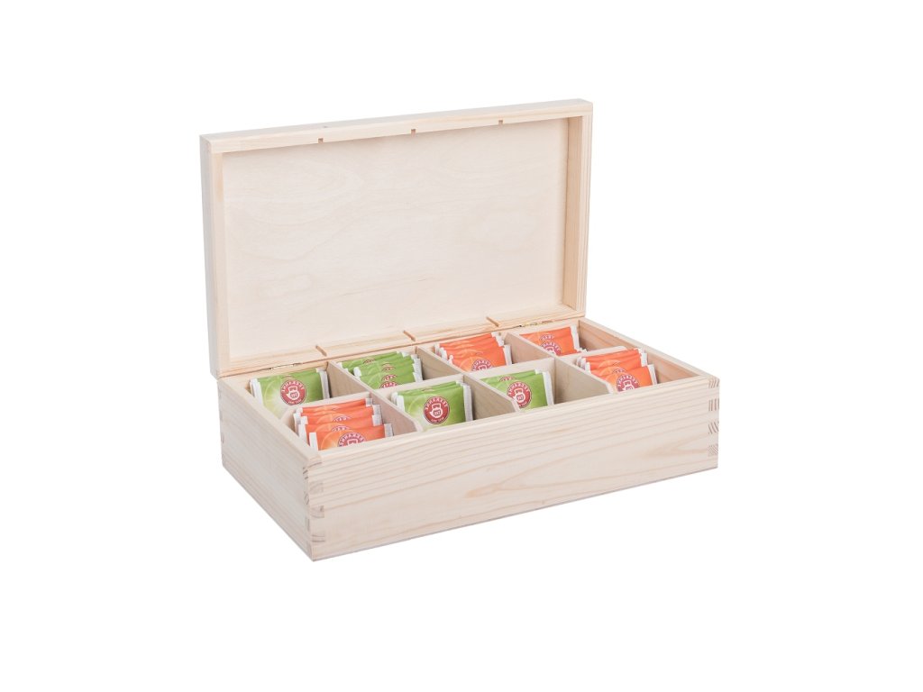 Škatla bo razveselila tudi kot izvirno darilo za ljubitelje čaja. Izdelan je iz borovega lesa, ima 8 predelkov, vsak pa je velik 6,5 x 7 cm.