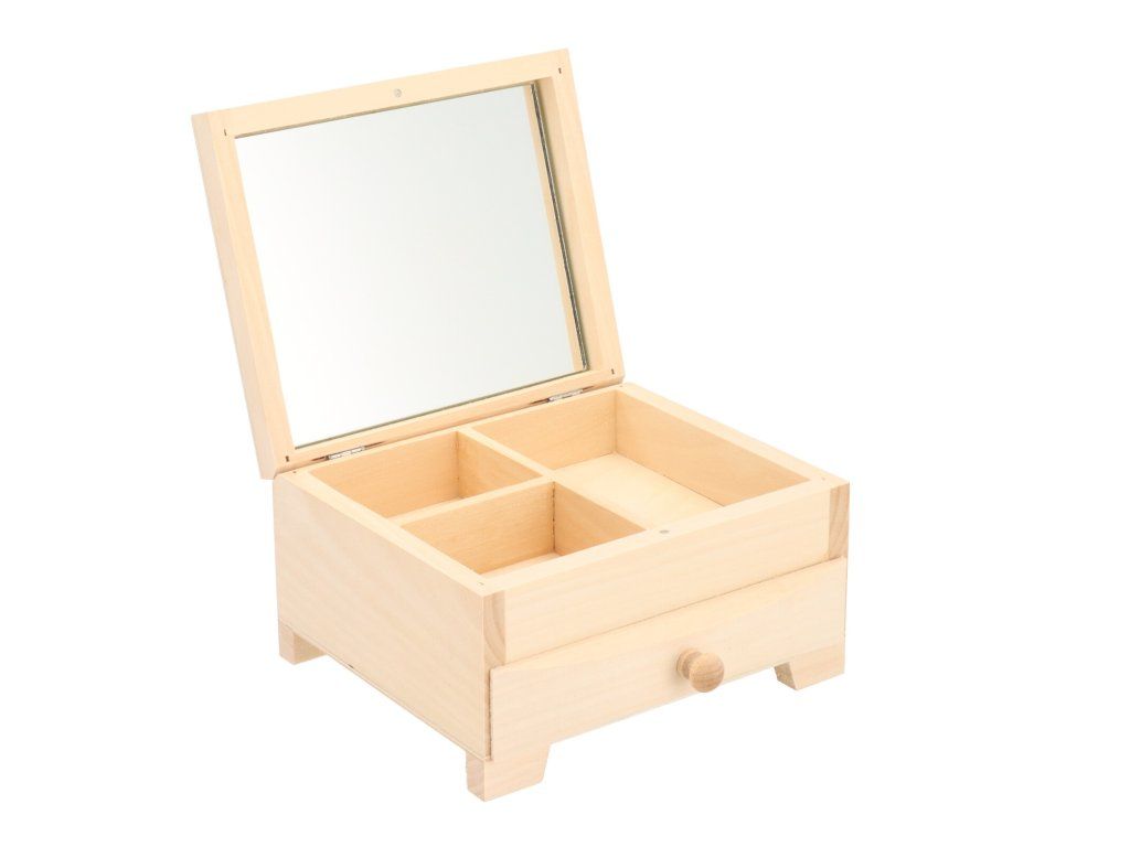 Škatla za nakit je izdelana iz borovega lesa in ni obdelana na noben način, kar še posebej cenijo ustvarjalke, saj lahko zahvaljujoč temu škatlo pobarvajo ali dodelajo z metodo decoupage.