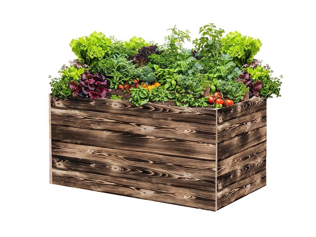 Lesena visoka greda znamke ATMOWOOD - popoln vrt na dosegu roke. Ožgana površina lesa je bolj odporna na vremenske vplive in lesne škodljivce.