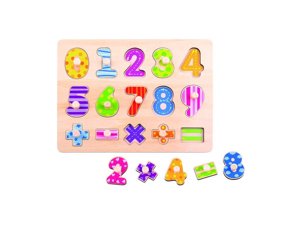 Barvite lesene sestavljanke s številkami otroke na zabaven način seznanijo s preprostimi matematičnimi primeri. Kosi imajo majhne lesene ročaje za lažji prijem.