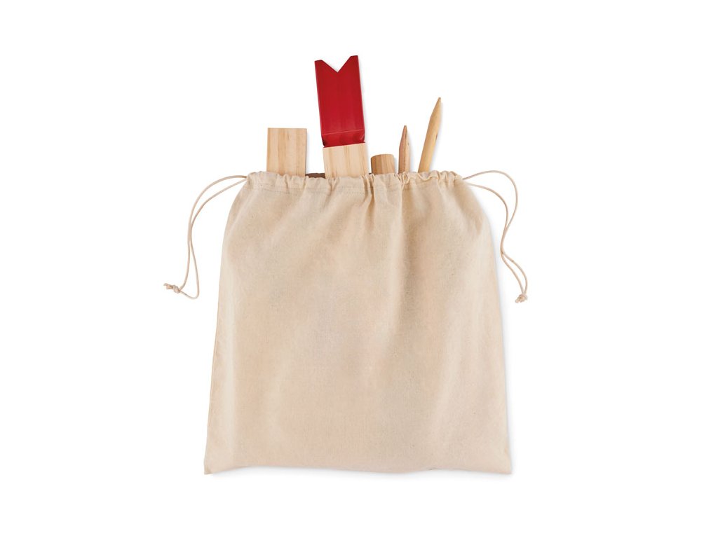 Igra je izdelana iz visokokakovostnega borovega lesa, kar zagotavlja vzdržljivost in prijeten naraven videz. Celoten komplet je priročno shranjen v bombažni vrečki z vrvico, zaradi česar ga je enostavno prenašati na vrt, v park, na plažo ali na počitnice.