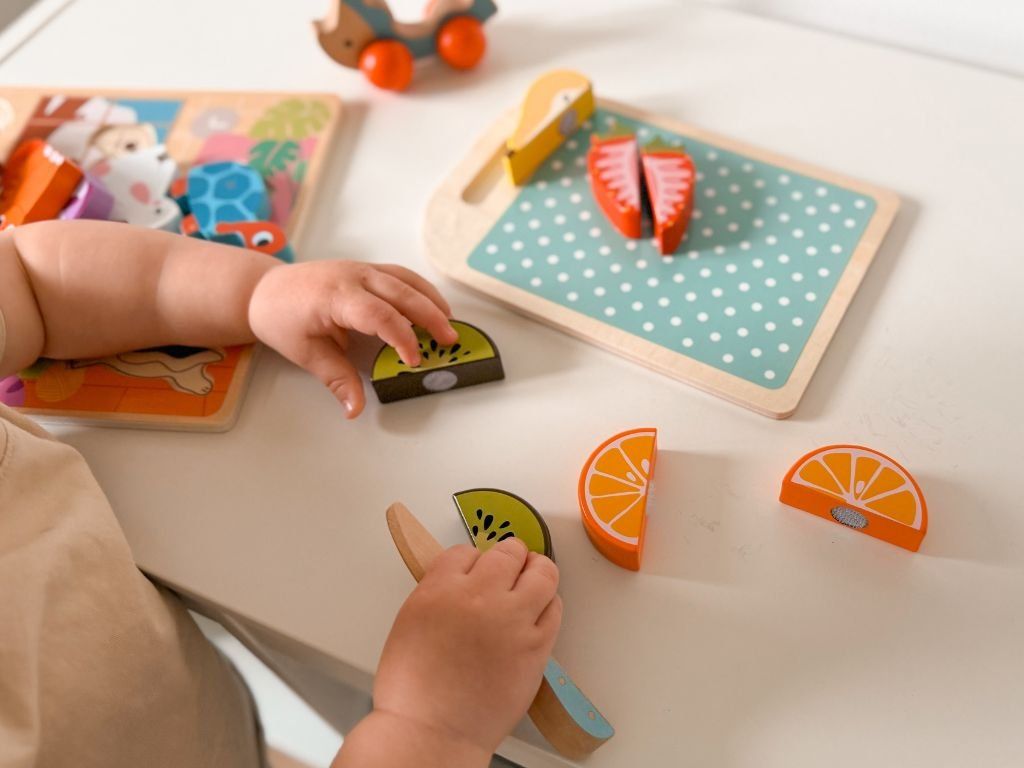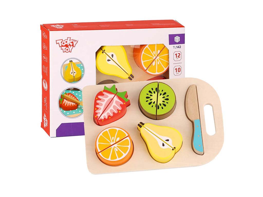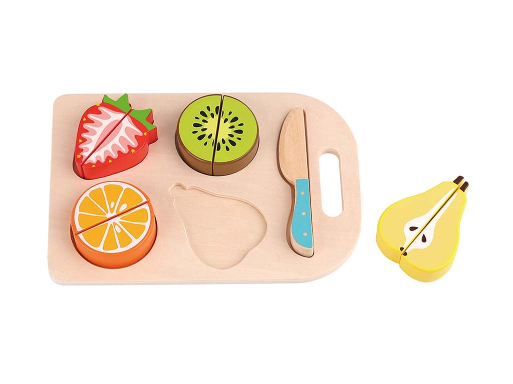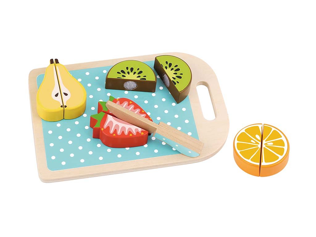Varna in ustvarjalna igrača, ki otrokom omogoča pripravo namišljenih prigrizkov. Vsebuje pisane koščke sadja, leseno desko za rezanje in nož, idealen dodatek za otroško kuhinjo ali trgovino.