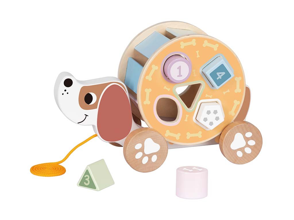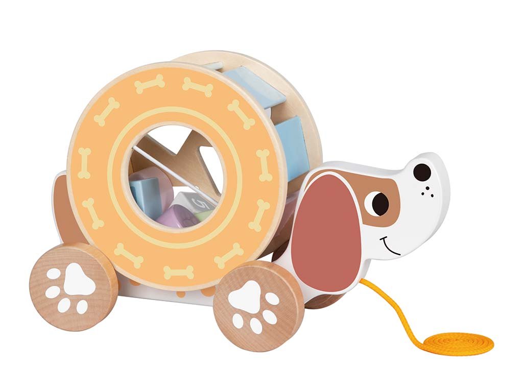 Prikupen vlečni kužek bo odličen prijatelj za prve korake in zabaven pomočnik pri učenju oblik. Otroci ga lahko vodijo za vrvico, medtem ko barvito telo v obliki bobna skriva luknjice za vstavljanje kock. Vsaka oblika ima svoje mesto, zato otroci urijo finomotoriko, logično razmišljanje in prepoznavanje številk in barv. Kužek združuje veselje do gibanja s kognitivno igro, zato bo priljubljena igrača doma in na poti.