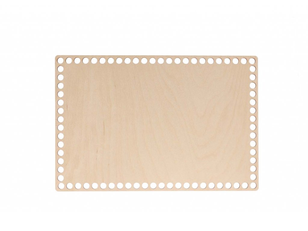 V ponudbi imamo pravokotno leseno dno iz brezove vezane plošče debeline 3 mm z luknjami premera 9 mm različnih velikosti . Primeren je za izdelavo kvačkanih košar iz sukanca in vrvice.