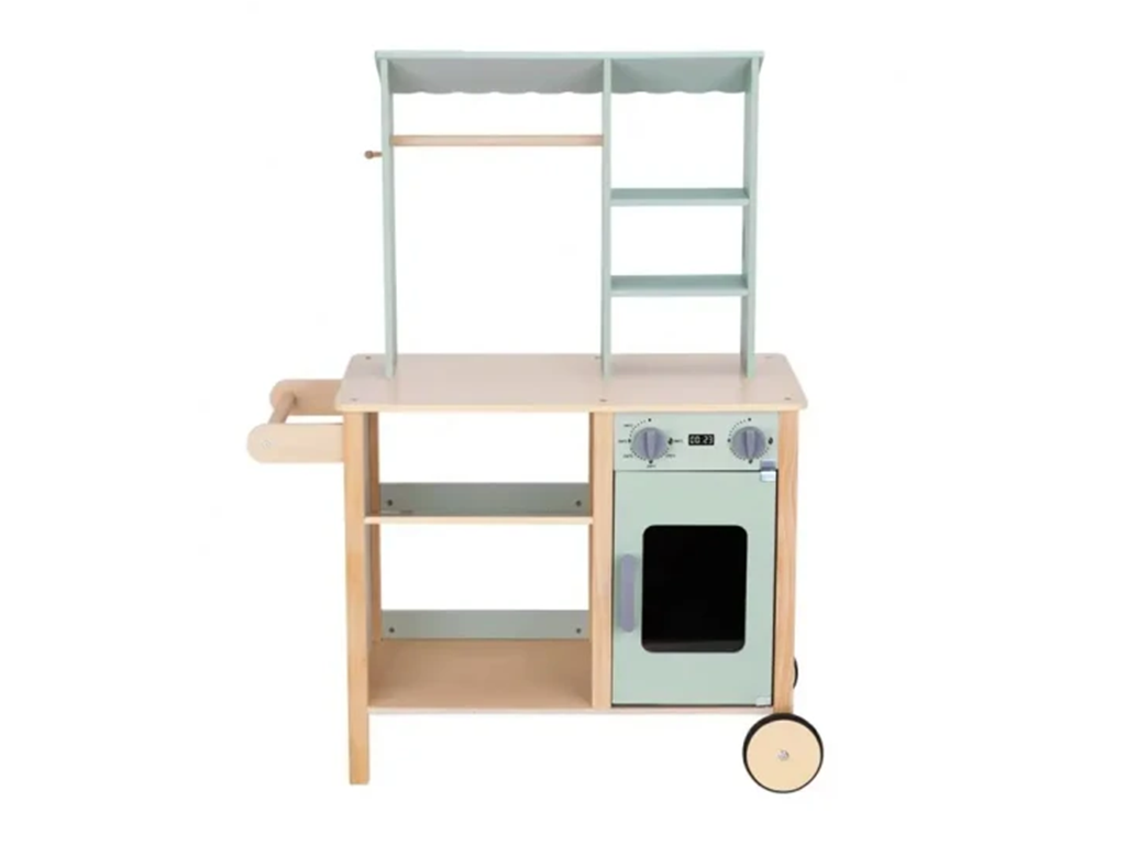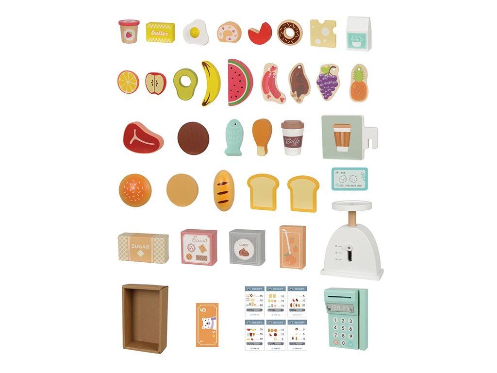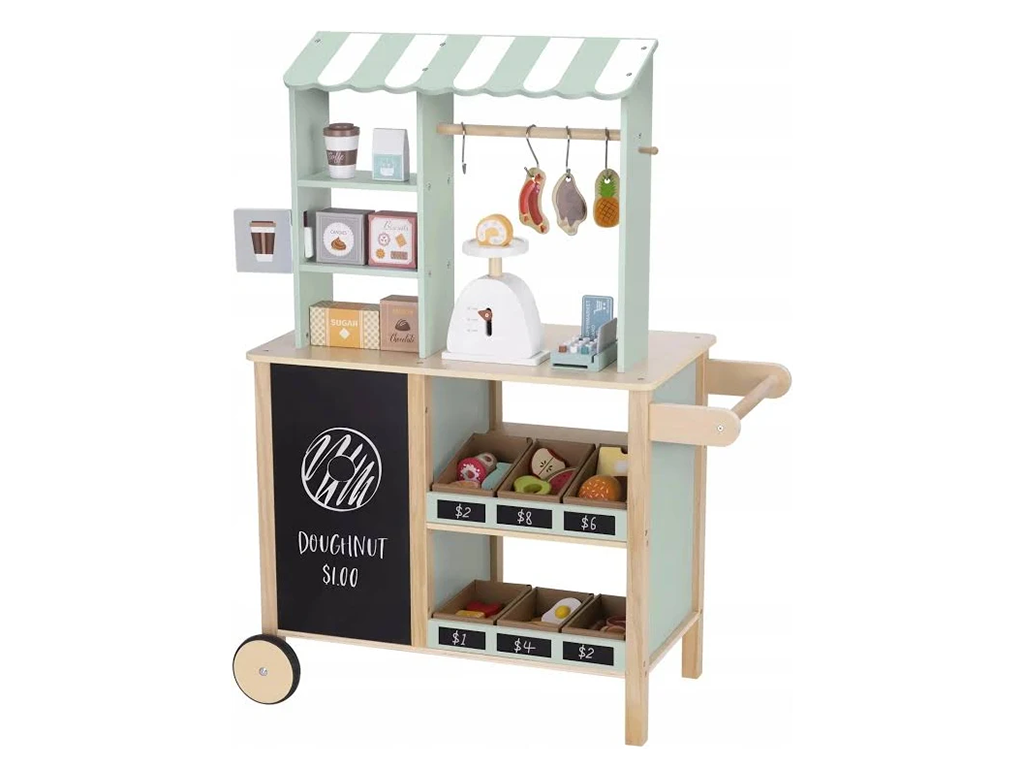 Spremenite otroško sobo v zabavno malo trgovino. Ta lesena stojnica otrokom omogoča, da preizkusijo vlogi prodajalca in kupca ter ustvarijo svoje nakupovalne zgodbe. Ne glede na to, ali prodajajo sadje, igrače ali namišljene priboljške, njihova domišljija nima meja.