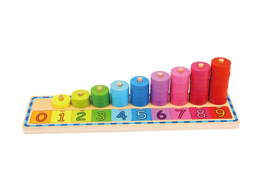Barvita lesena igra je odličen pripomoček za uvajanje otrok v številke in štetje. Zahvaljujoč preprosti in jasni zasnovi podpira naravni razvoj matematičnih spretnosti, logičnega mišljenja in koncentracije. Otroci se učijo prepoznavati številke, jim pravilno dodeljevati ustrezno število krogov in hkrati razlikovati barve.