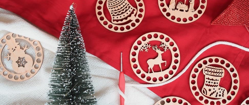 Okrogel božični okrasek z vgraviranim imenom je narejen iz svetle brezove vezane plošče. Ustvarite si izvirne dekoracije za drevesce ali podarite kvačkan okrasek.