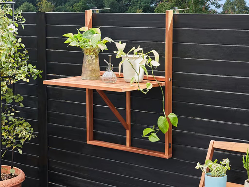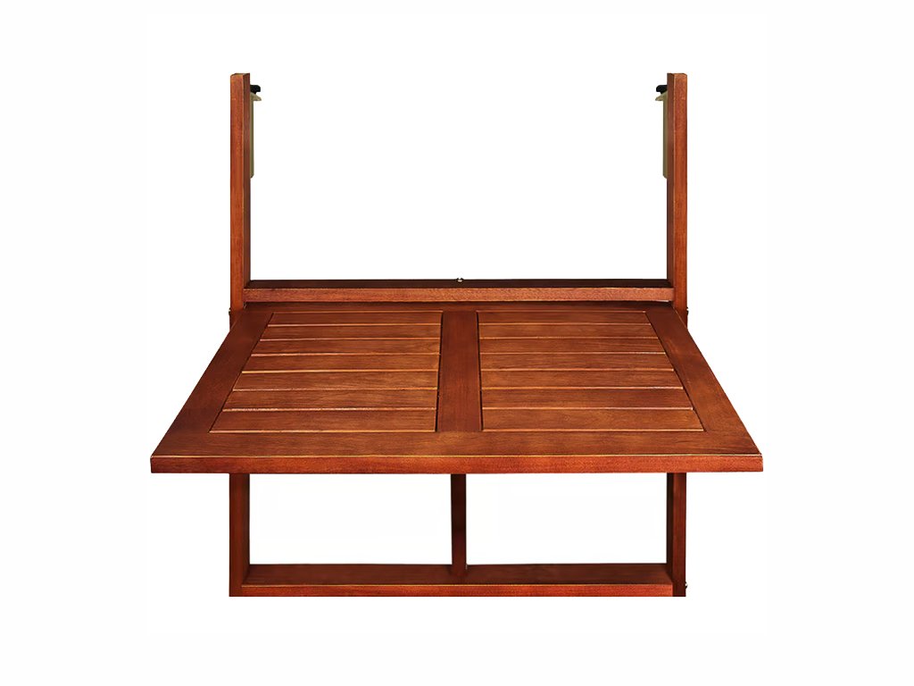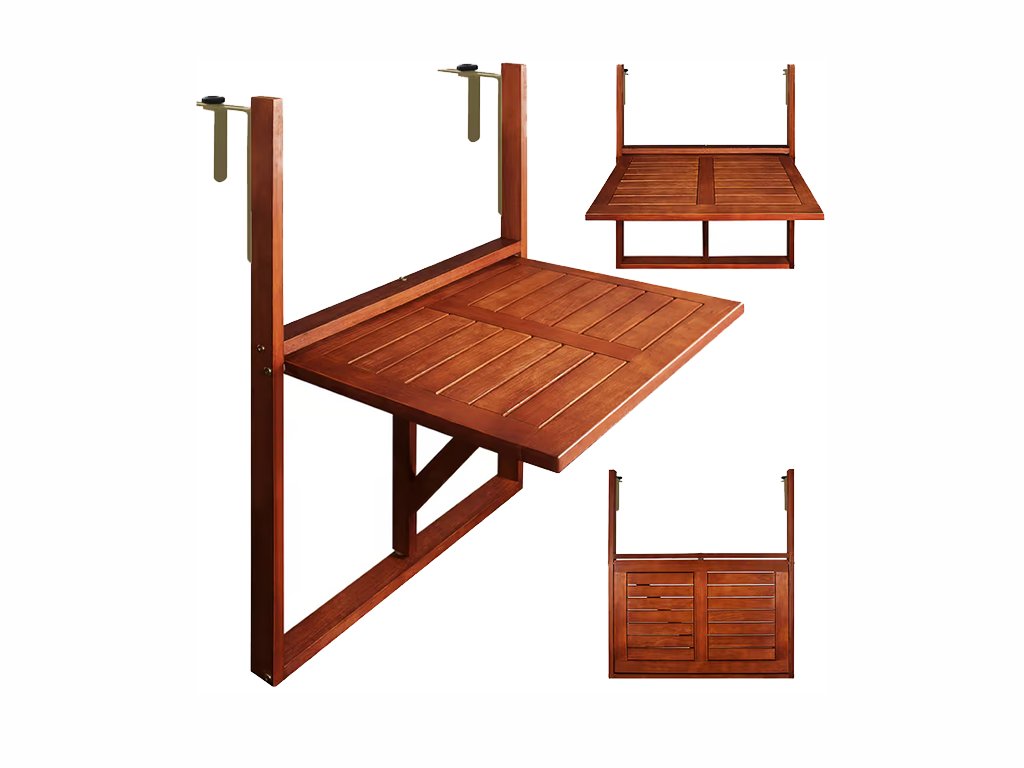 Praktična viseča balkonska miza iz masivnega akacijevega lesa je idealna rešitev za majhne balkone in ozke prostore – preprosto jo obesite čez ograjo ali okensko polico.